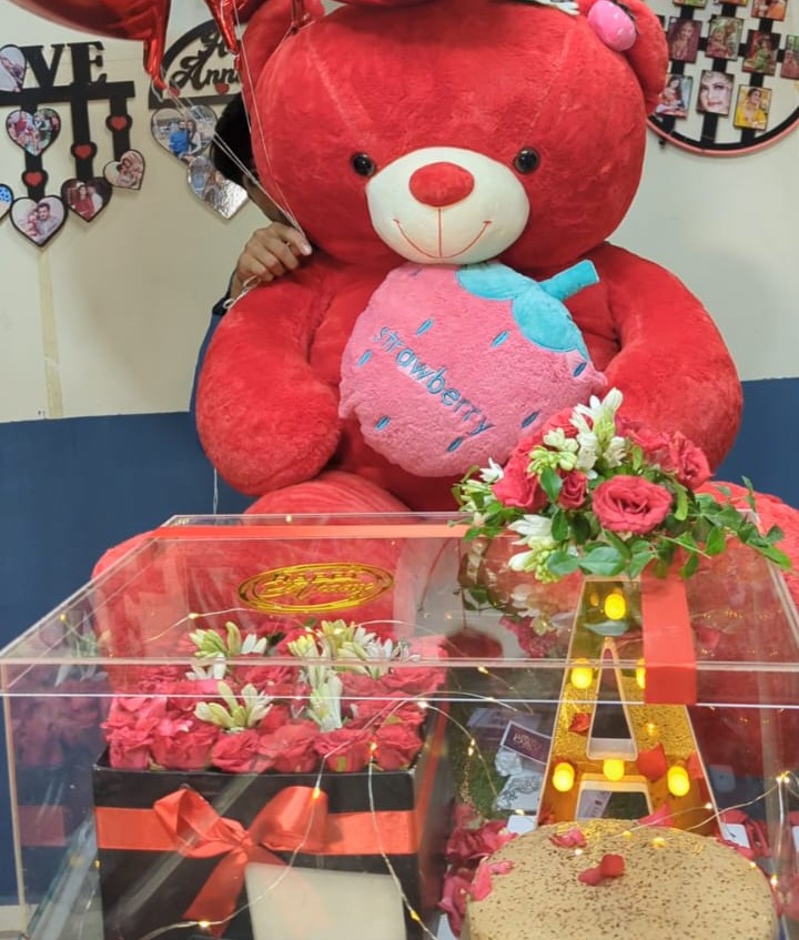 This is the price of glass box with floral box, Layers Bakery 2.5 lb cake, Led Letter, Name Bracelet and floral arrangment.