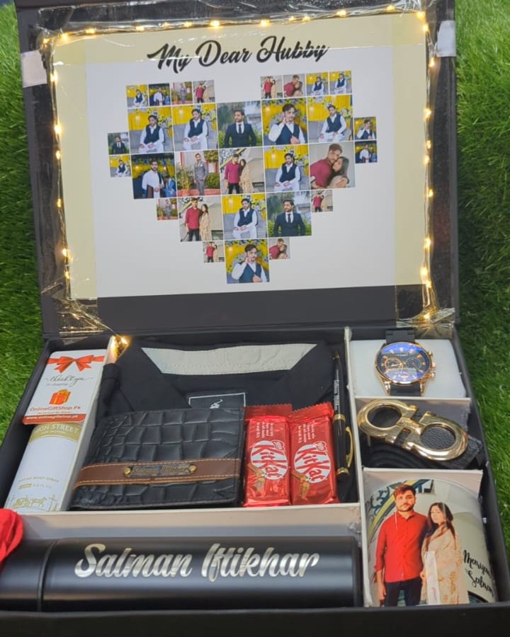 A specially designed gift box for your hubby with customized water bottle, customized wallet, customized mug, watch, body spray, belt, chocolates, shirt and customized wishing cards